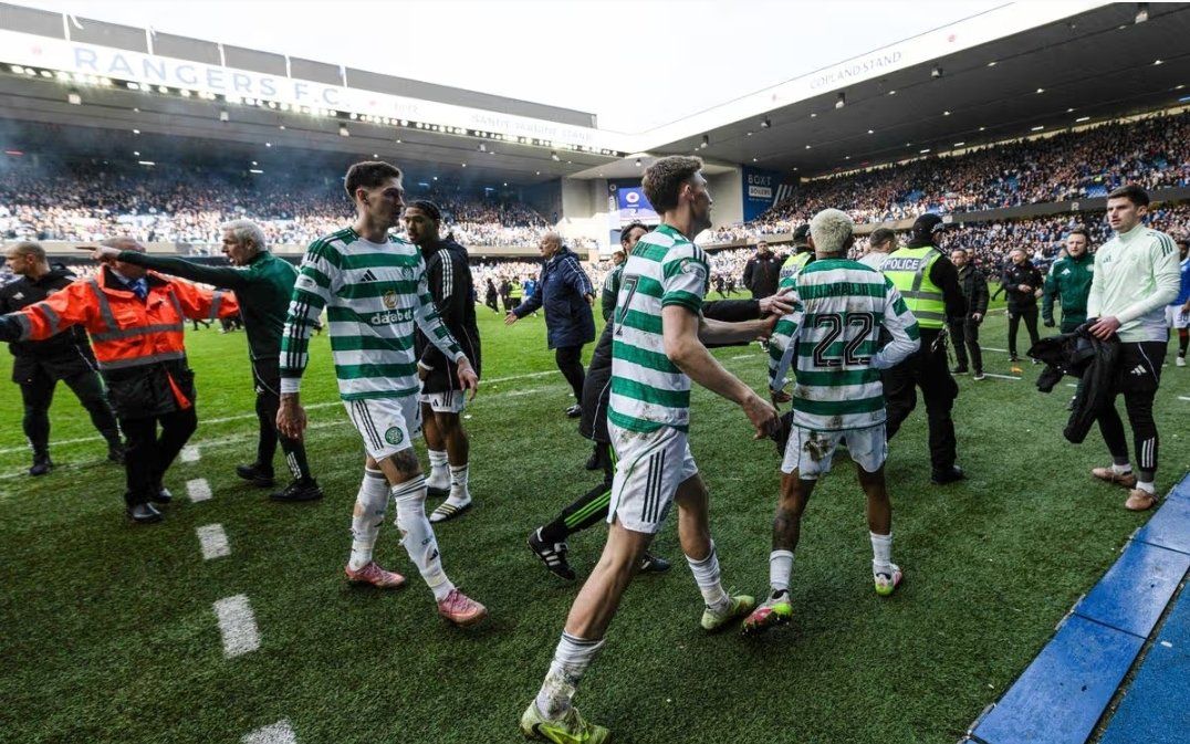 Celtic players are escorted off the pitch at Ibrox