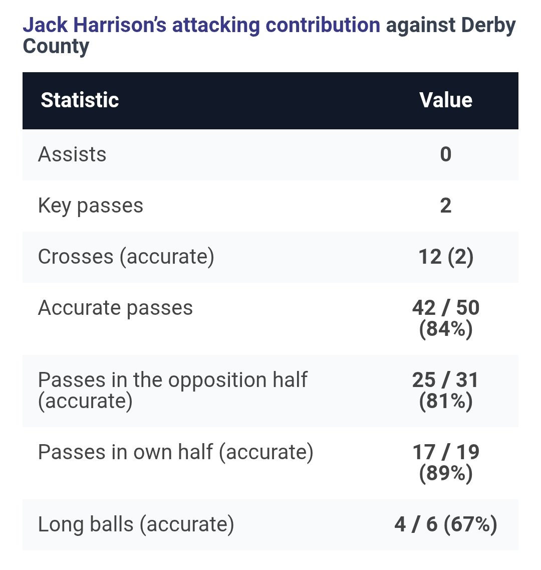 With Leeds enjoying long spells of possession, Harrison was not heavily tested defensively. However, it was his attacking output that raised the most concern. His delivery from wide areas was inconsistent, and several crossing opportunities broke down without troubling the Derby defence. There was little evidence to suggest he could provide genuine competition for Gabriel Gudmundsson in the left-sided role.