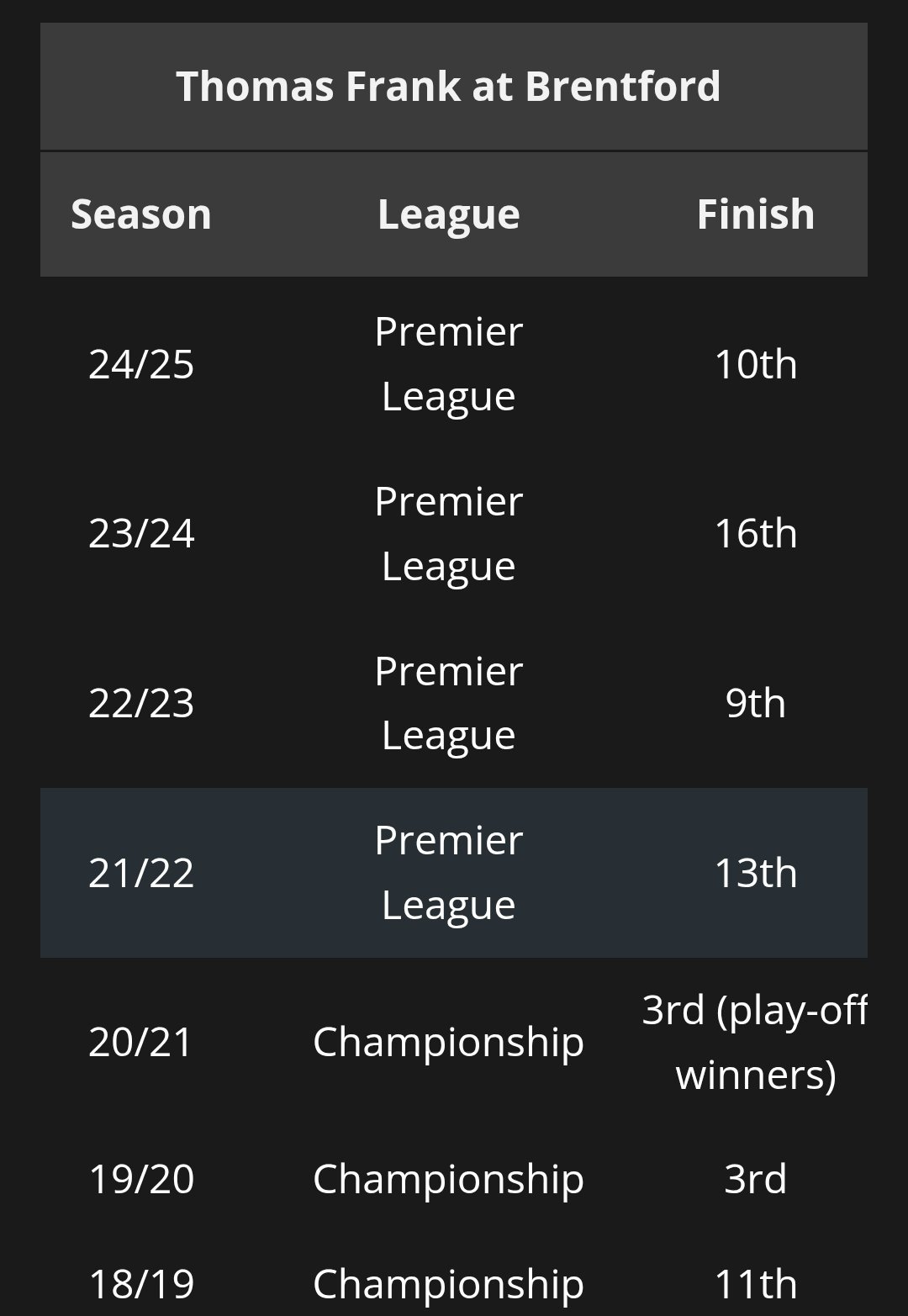 At Brentford, Frank oversaw a remarkable transformation. He guided the club from a mid-table position in the EFL Championship to promotion via the play-offs, before establishing them as a competitive side in the Premier League.