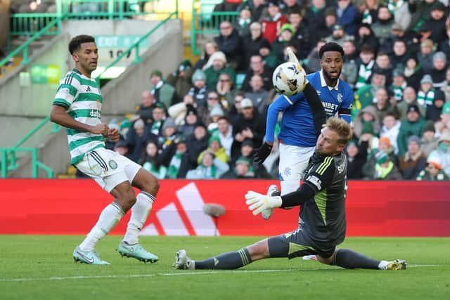 Rangers’ Youssef Chermiti places the ball past Celtic’s Kasper Schmeichel to put them 2-1 up. | Getty Images