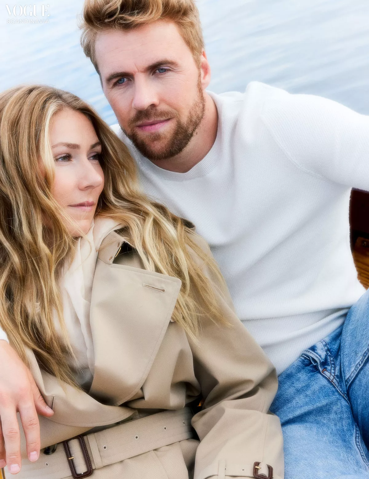 The couple properly connected whilst Mikaela was navigating the death of her father and Aleksander was overcoming a knee injury. He reached out to her on social media and they’ve been each other’s unwavering support ever since. Mikaela wears Classic belted trench coat, €2,131. Burberry. 18k yellow gold earrings with diamonds, €18,700. Ole Lynggaard. Cotton scarf. Mark Kenly Domino Tan. Aleksander wears Cotton sweater, €349, Denim trousers, €120. Both BOSS. Photo: Eivind Hamran