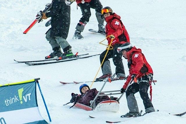 Mikaela Shiffrin getting taken away by ski patrol after crashing in the 2024/2025 Women’s World Cup Giant Slalom