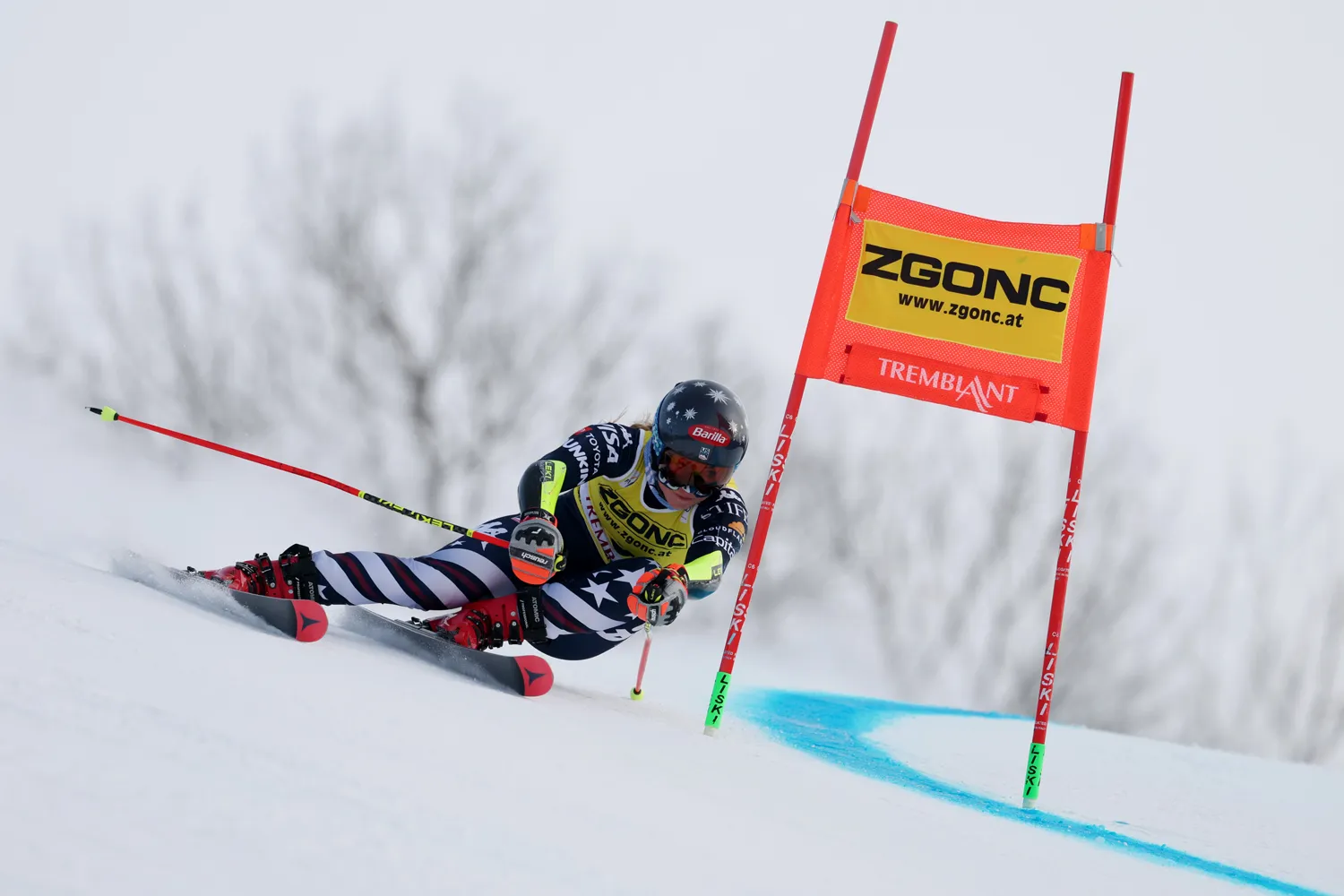 Mikael Shiffrin races down the slope during the first run of women’s giant slalom during the PwC Tremblant World Cup 2025 at Mont Tremblant on Dec. 7, 2025.