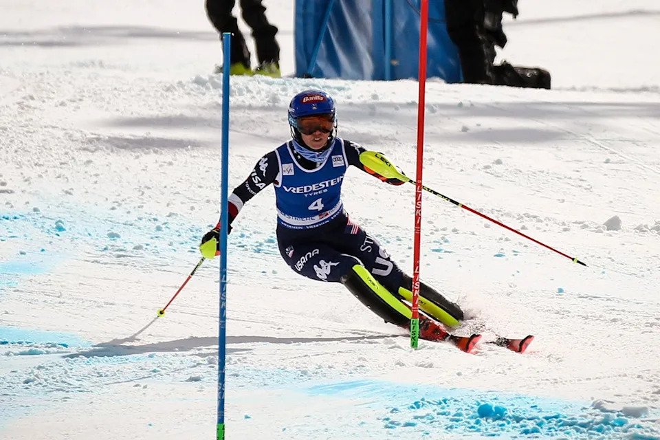 Mikaela Shiffrin competes in the Audi FIS Alpine Ski World Cup Women’s Slalom in Sestriere, Italy, on Feb. 23, 2025