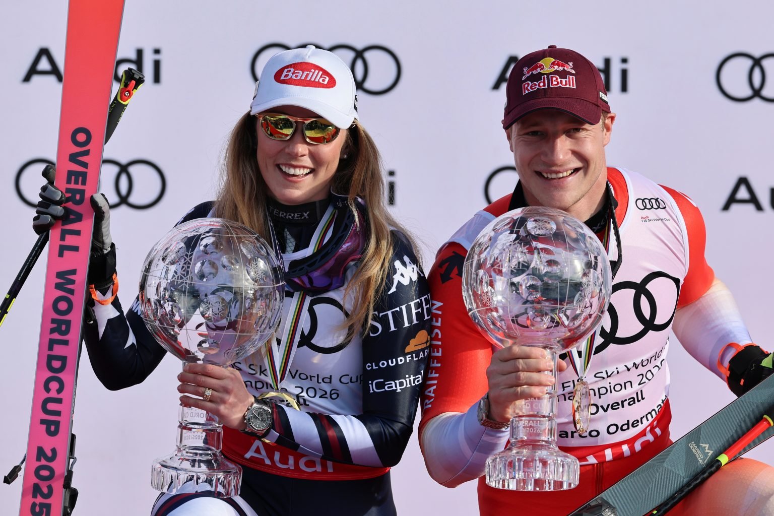 Mikaela Shiffrin, left, and Switzerland’s Marco Odermatt celebrate winning the respective women’s and men’s overall World Cup skiing title, at the Lillehammer World Cup Finals, in Hafjell, Norway, Wednesday, March 25, 2026.Marco Trovati/AP photo