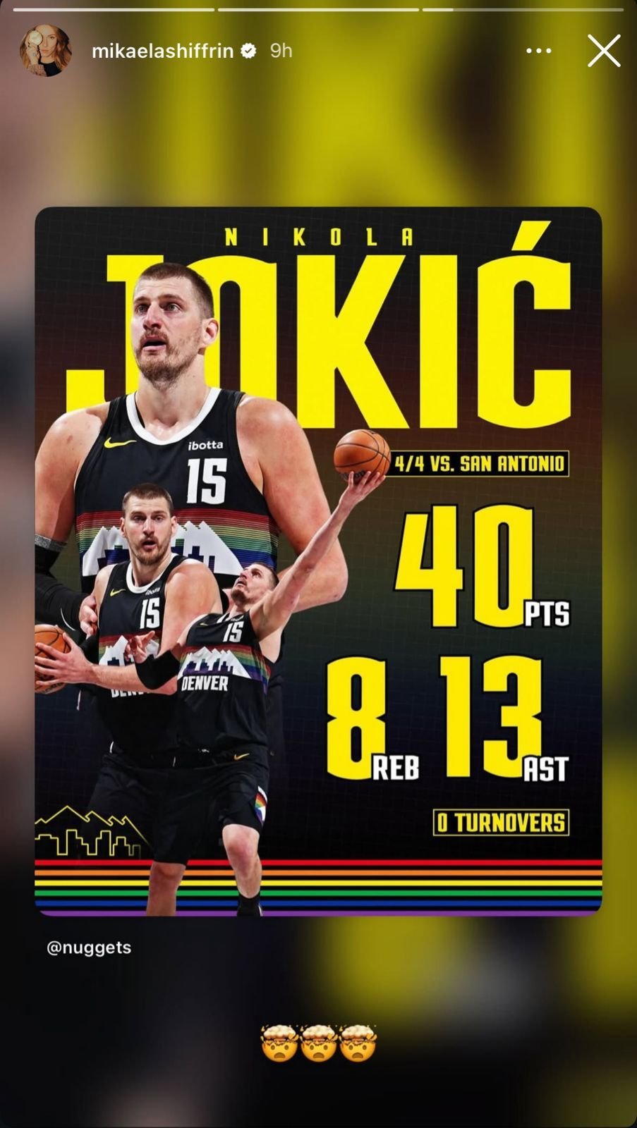 Mikaela Shiffrin stunned by Nikola Jokić’s 40-point masterclass versus Spurs.