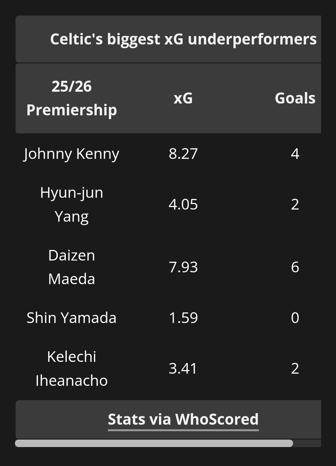 Alongside Kenny, players such as Hyun-jun Yang, Kelechi Iheanacho and Shin Yamada have also failed to live up to their underlying numbers, but Kenny’s case stands out because of the role he has been given. He has started eight of his 13 league appearances and has been trusted as the central striker in four of Celtic’s last five Premiership matches. Despite that faith, he has not shown enough consistency or composure to suggest he can be relied upon week in, week out.