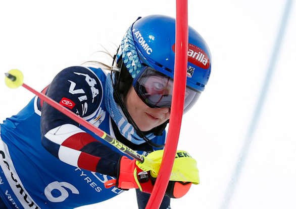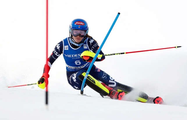 Mikaela Shiffrin competes in the first run of the women’s Slalom of the FIS Alpine Skiing World Cup event in Courchevel, French Alps, on Jan. 30, 2025.