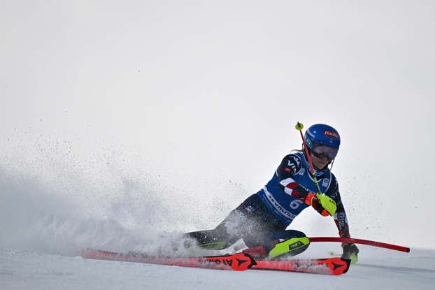 US Mikaela Shiffrin competes in the Women’s Slalom event during the FIS Alpine Skiing World Cup in Sestriere, Italy, on February 23, 2025.