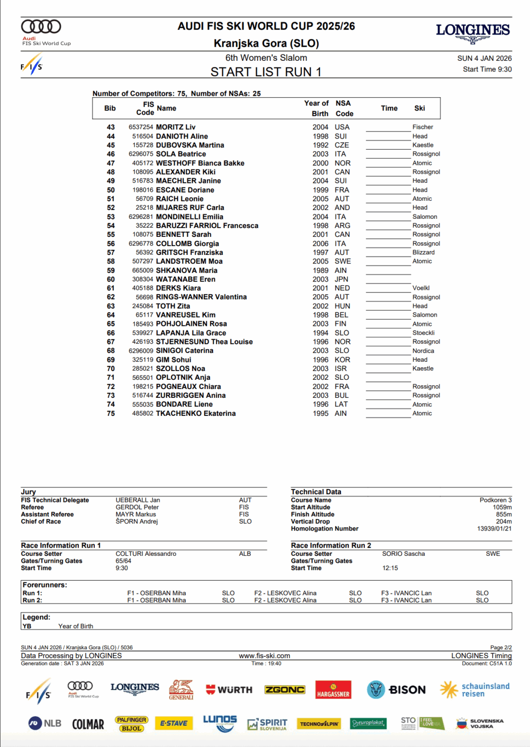 A loaded start list in Kranjska Gora
