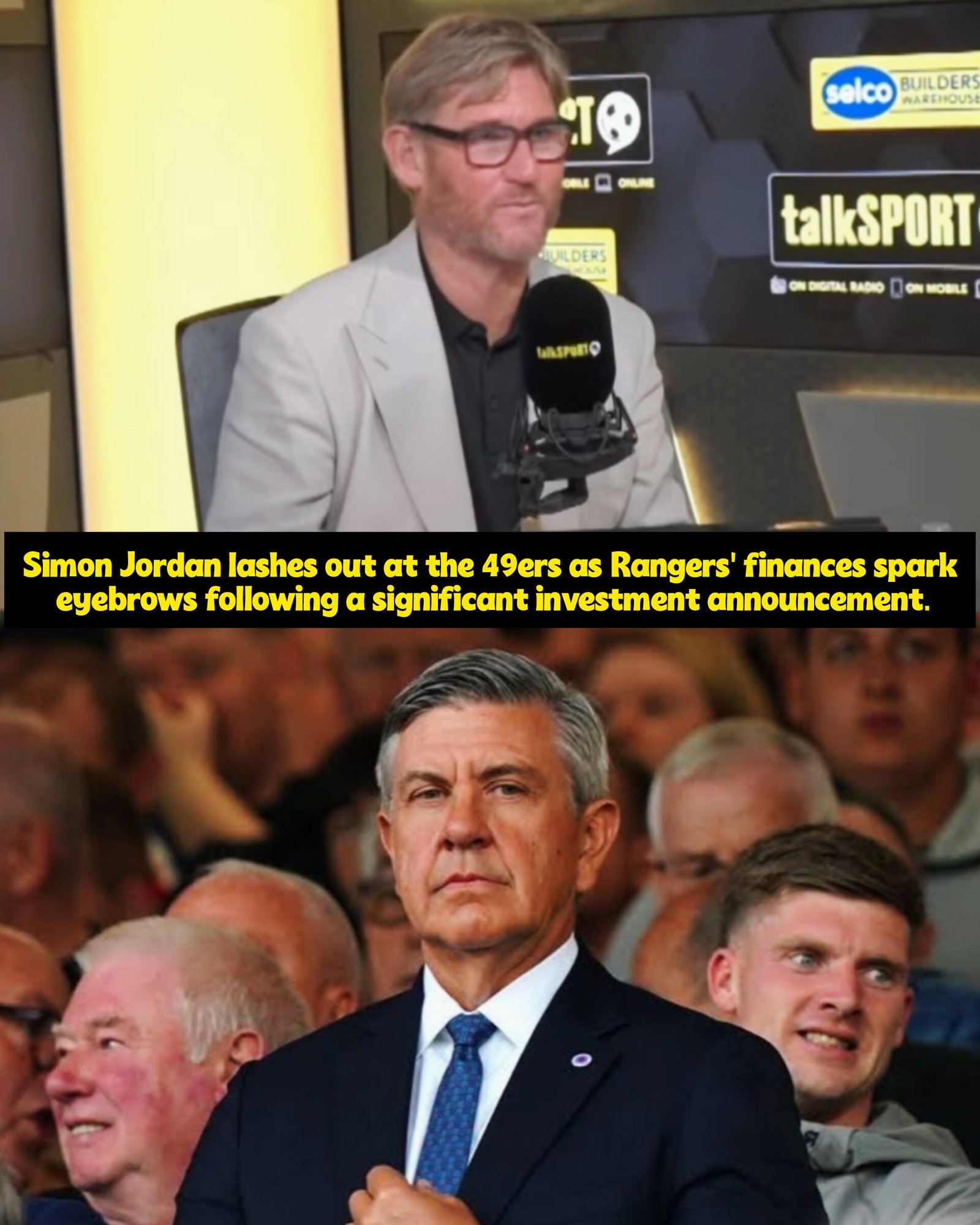Simon Jordan criticizes the 49ers as Rangers’ finances attract scrutiny following a major investment plan.