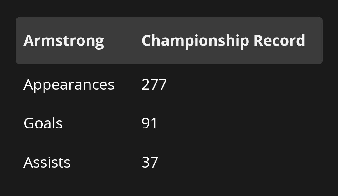 Across his Championship career, Armstrong has made 277 appearances, scoring 91 goals and providing 37 assists. Those numbers alone underline his consistency, but his overall senior career tally stands even taller, with 139 goals scored across all competitions.