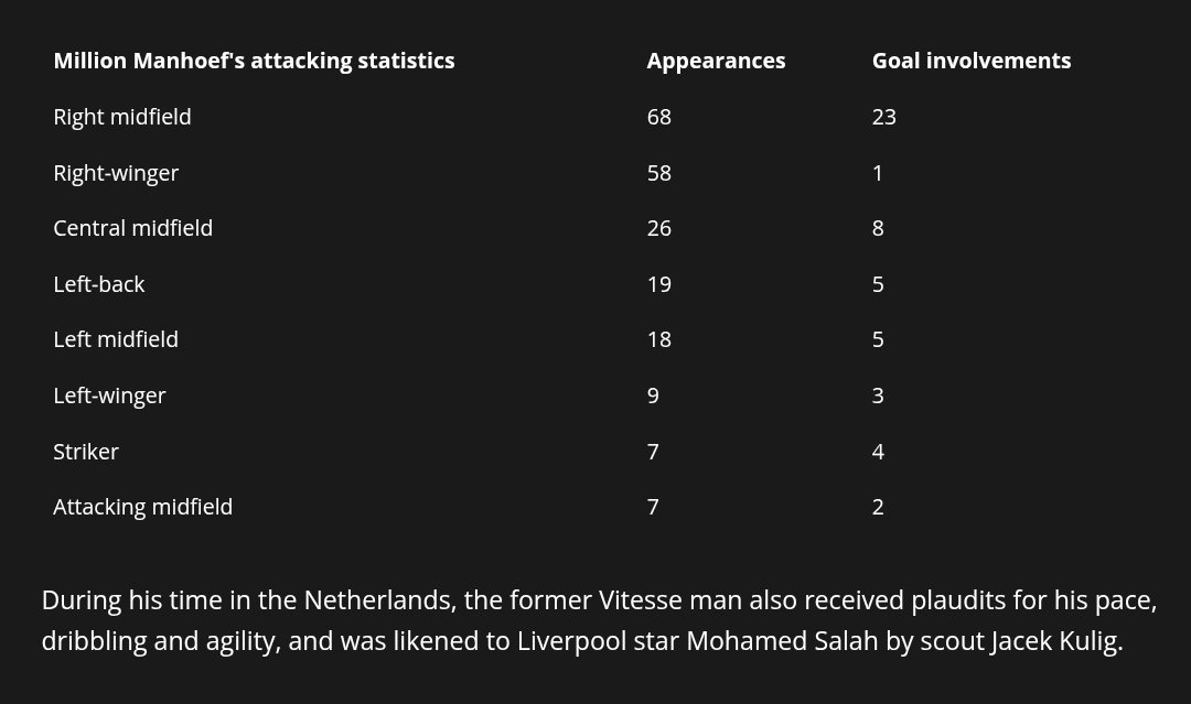 During his time in the Netherlands, Manhoef earned recognition for his pace, dribbling ability, and agility. These traits led scout Jacek Kulig to compare him to Mohamed Salah.